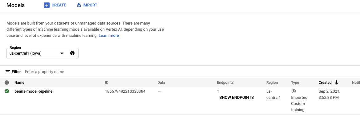 이렇게 학습이 끝난 모델은 export 된 후, serving이 가능한 형태로 컨테이너로 패키징이 되서 Vertex.AI Models 에 저장되게 되는데, 아래는 실제로 모델이 Models 리파지토리에 저장된 결과이다.