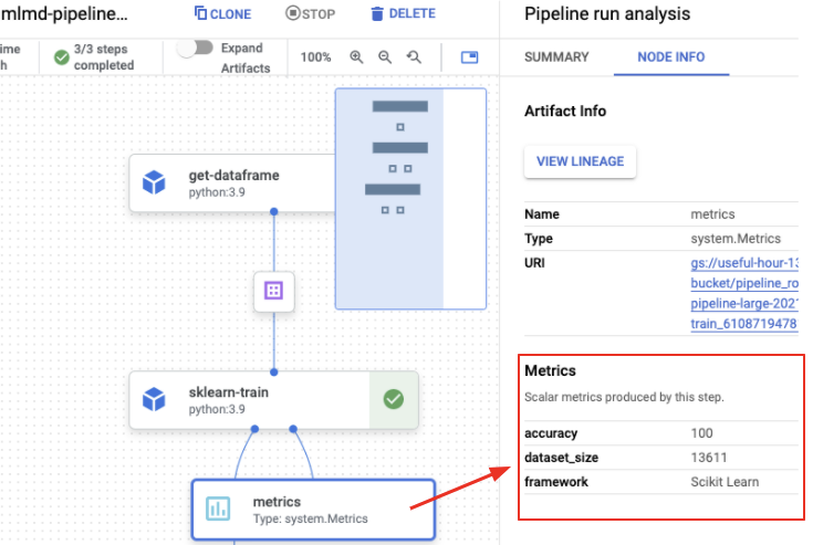 아래 파이프라인에서 보면 sklearn-train에서 training accuracy와 dataset_size 등을 메타데이타에 저장하였는데, 메타데이터 아이콘을 클릭하면 아래 그림과 같이 저장한 메타 데이터를 확인할 수 있다.