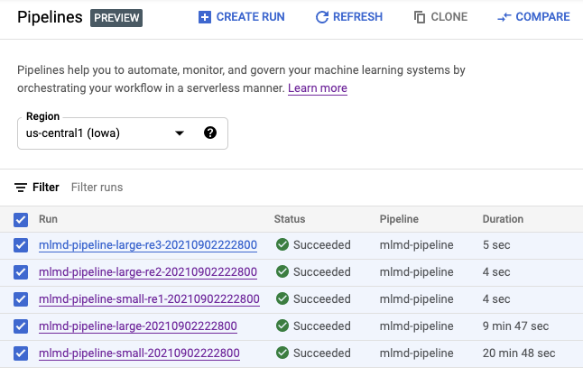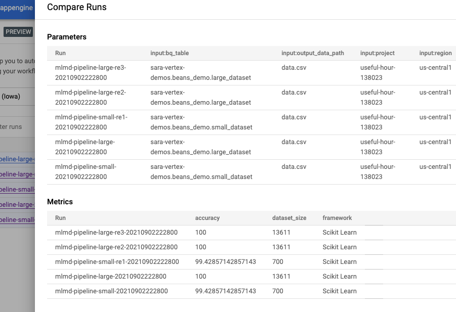 Pipeline 메뉴로 가면 과거에 실행한 그리고 실행중인 파이프라인을 볼 수 있는데, 실행된 파이프라인들을 아래 그림과 같이 여러개를 선택한 후에 Compare 버튼을 누르면 메타 데이타를 비교할 수 있다.