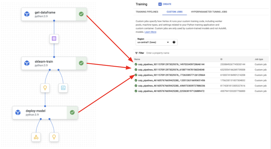 각 컴포넌트는 실행될때 도커 컨테이너로 구현된 컴포넌트를 실행하는데, 실행 런타임은 Vertex.AI > Training을 사용한다. Custom Job 메뉴를 보면 각 컴포넌트들이 실행된 Job을 모니터링할 수 있다. (아래 그림)