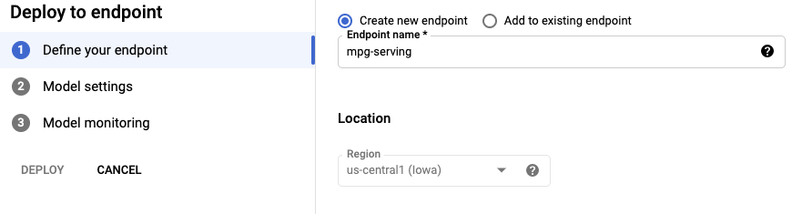 이 예제에서는 새로운 모델을 처음 배포하는 것이기 때문에, Create new endpoint를 선택한다.