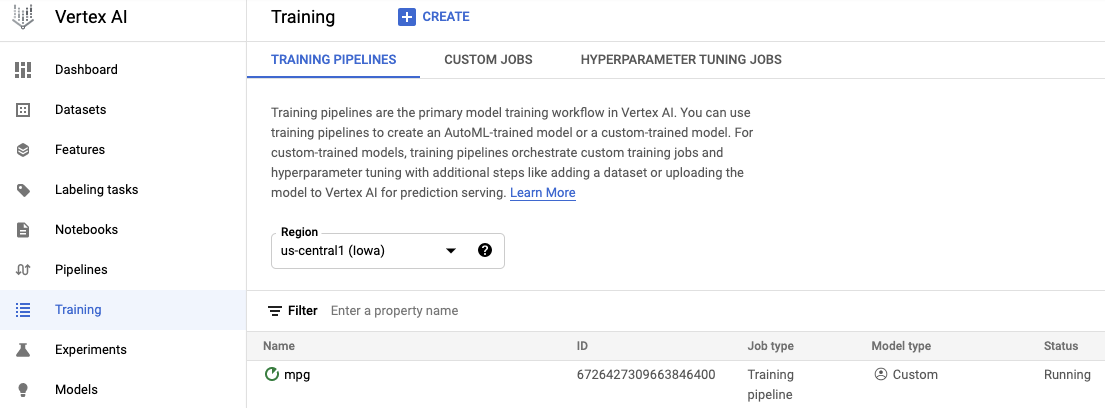 Vertex.AI > Training 메뉴로 가서 Create를 하여 새로운 Training Job을 등록한다.