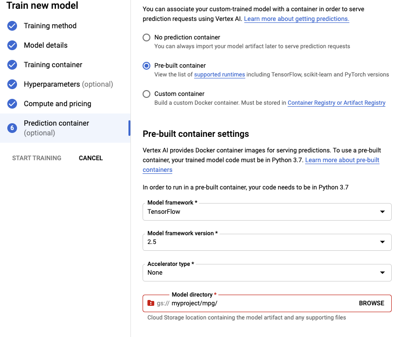 Prediction 컨테이너에 탑재할 서빙용 모델을 선택해야 하는데, 아래 “Model directory” 부분에 모델이 export 되서 저장되는 디렉토리를 선택한다. 앞의 모델 코드에서 model.save를 이용해서 지정한 GCS 버킷을 지정하면 된다.