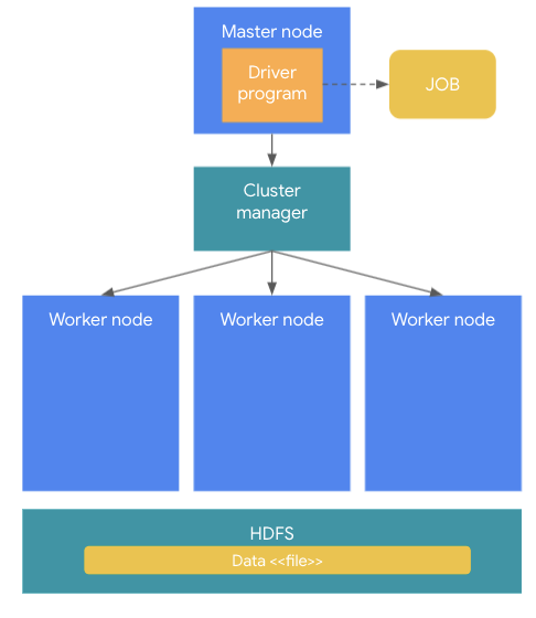 스파크 클러스터의 구조는 크게 Master node 와 worker 노드로 구성된다. Master node는 전체 클러스터를 관리하고 분석 프로그램을 수행하는 역할을 한다. (사용자가 만든 분석 프로그램을 Driver Program 이라고 한다.) 이 분석 프로그램을 스파크 클러스터에 실행하게 되면 하나의 JOB이 생성된다. J
