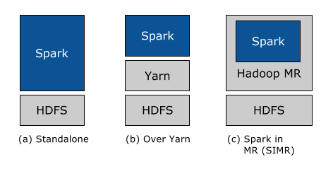 Standalone은 하나의 머신 내에서 스파크를 운영하는 방식으로 로컬 개발 환경등에 적합한다. 다른 방식으로는 하둡 2.X의 리소스 매니저인 YARN을 사용하여, YARN으로 하여금 클러스터내에 TASK를 배치하도록 하는 방법이 있고, 하둡 1.X 이하를 사용할 경우 하둡의 맵리듀스안에 맵 작업으로 스파크 TASK를 맵핑하는 Spark In MR (SIMR)방식이 있다.
