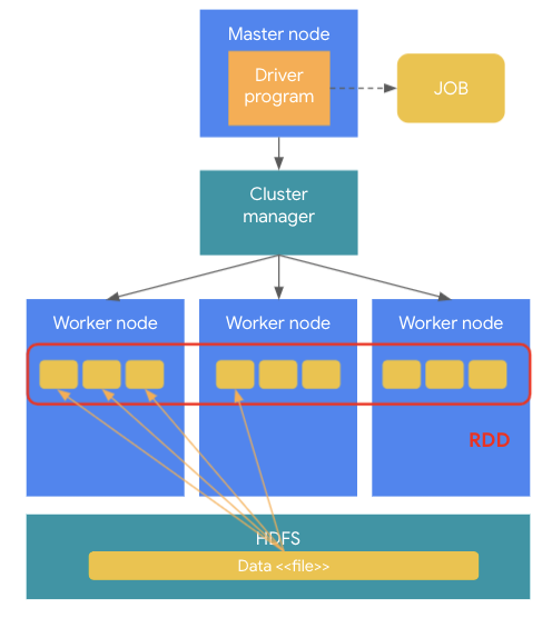이렇게 생성된 JOB이 외부 저장소 (HDFS와 같은 파일 시스템이나 외부 데이터 베이스)로 부터 데이터를 로딩하는 경우, 이 데이터는 스파크 클러스터 Worker node로 로딩이 되는데, 로딩된 데이터는 여러 서버의 메모리에 분산되어 로딩이 된다. 이렇게 스파크 메모리에 저장된 데이터 객체를 RDD라고 한다.