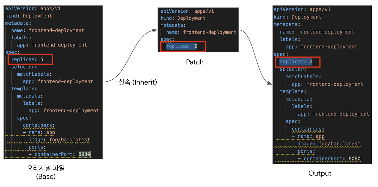 오리지널 파일이 있는 디렉토리 (base)를 만든 후에, 각 환경별로 다른 디렉토리(dev)를 만들고 환경별 디렉토리마다 변경할 내용이 정의된 patch 파일을 작성한다.