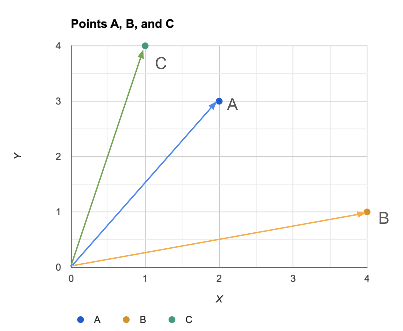 예를 들어 벡터 A(2,3), B(4,1), C(1,4)가 아래 그림과 같이 있다고 하자