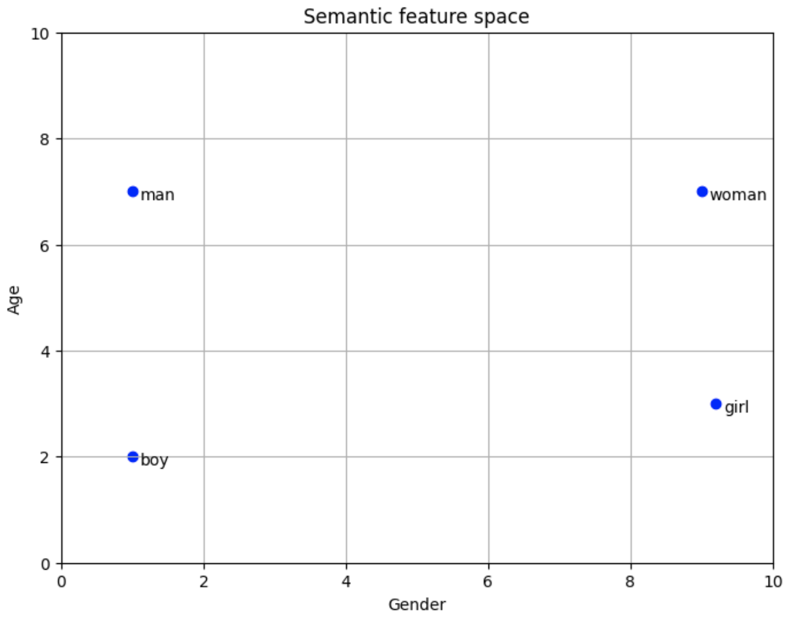 이 벡터에서 첫 번째 차원은 성별을 나타낸다. "man"과 "boy"는 첫 번째 차원에서 1로 표현되어 있어서 남성이라는 것을 나타내고. "woman"과 "girl"은 첫 번째 차원에서 9로 표현되어 있어서 여성이라는 것을 나타낸다.