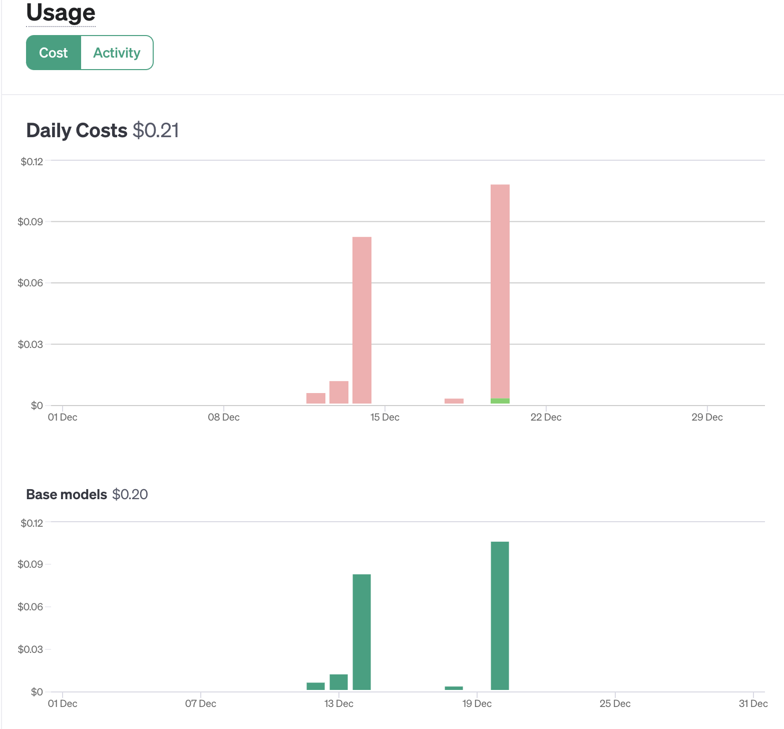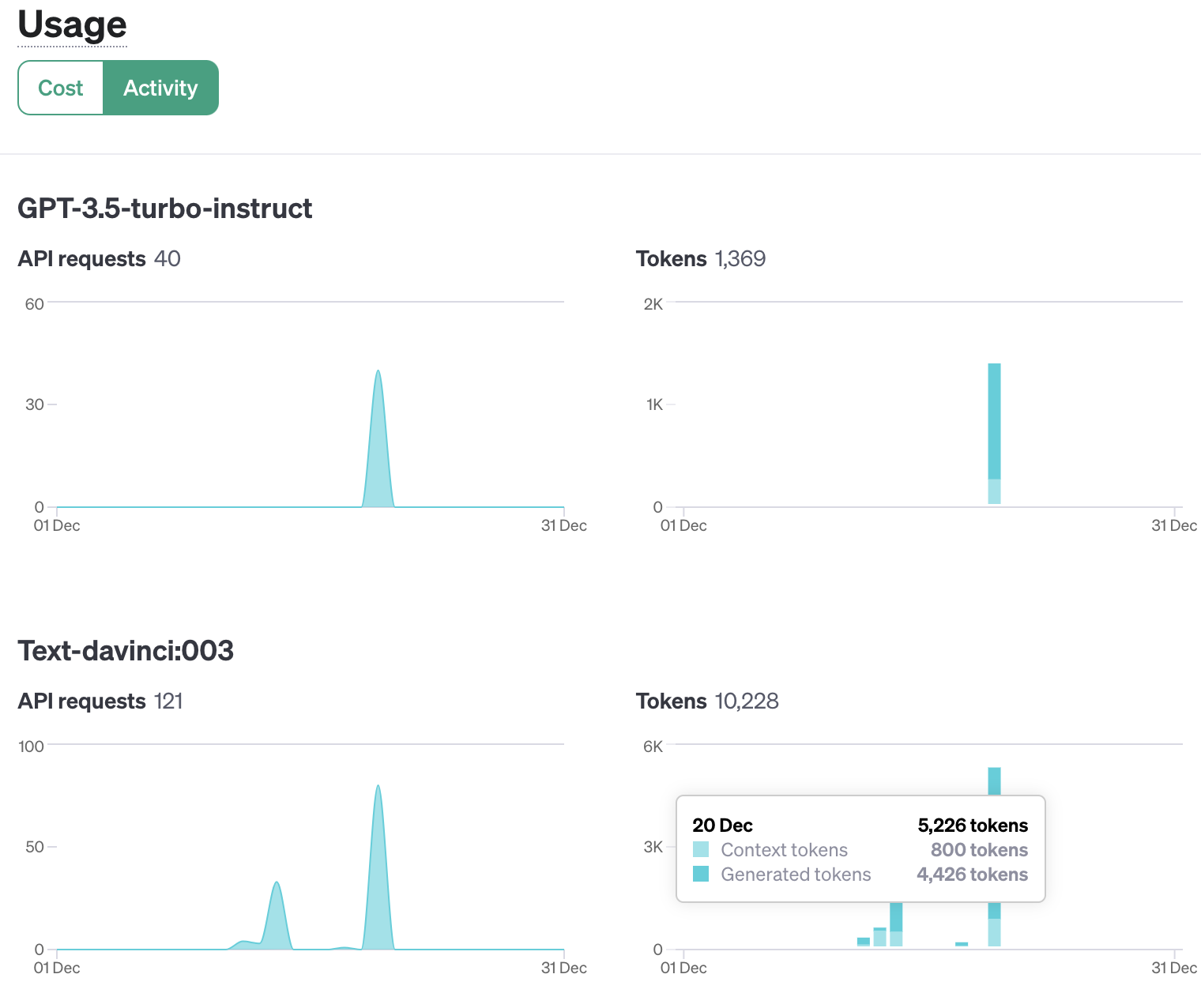 API의 사용량을 확인하려면 보통 콘솔을 사용하면 되는데, OpenAI의 ChatGPT의 경우에는 https://platform.openai.com/usage 에서 API 호출수, 토큰 그리고 가격등을 모니터링할 수 있다.