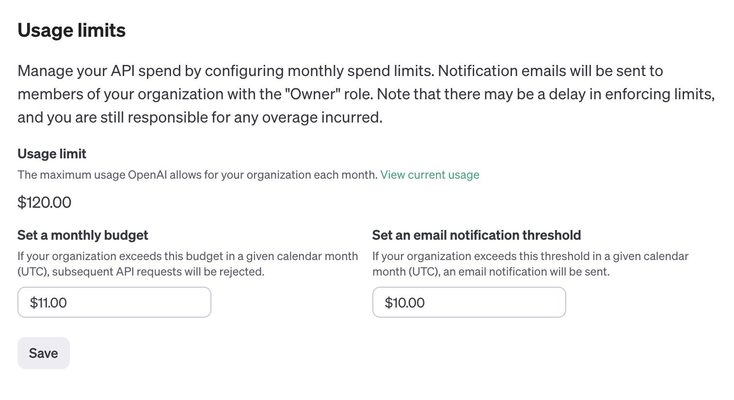 API 호출에는 비용이 들어가는데, 개발을 하면서 비용 모니터링을 신경쓰지 않으면 잘못하면 대규모로 호출이 되면서 모르는 사이에 비용이 과다 청구될 수 있다. 그래서 대부분의 서비스들은 사용량에 대한 제한을 줄 수 있도록 하고 있다. 아래는 OpenAI chatGPT에 대한 사용량 제한 기능으로, “Set Monthly budget”을 통해서 한달에 11$ 이상을 사용할 수 없도록 하였고, 만약에 10$ 이상을 사용할 경우 이메일로 알리도록 하였다.