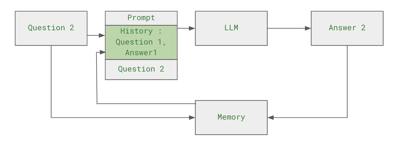 다음 대화에서 질문이 추가로 들어오면, 메모리에 저장된 기존의 대화 내용 (Question 1, Answer 1)을 불러서, 프롬프트 템플릿에 컨텍스트 정보로 추가하고, 여기에 더해서 새로운 질문 (Question 2)를 추가하여 LLM에 질의 한다.
