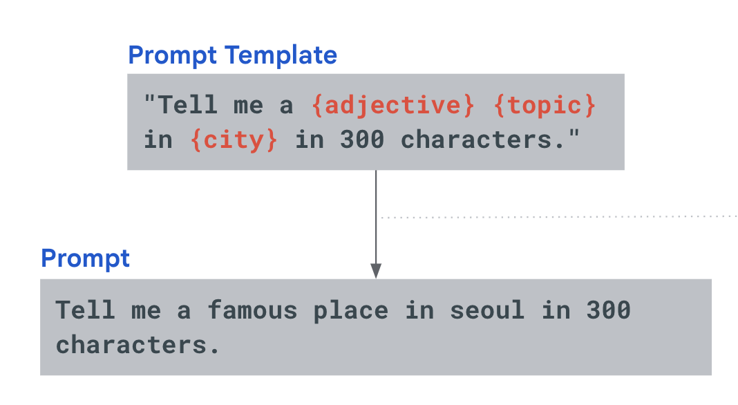 아래 그림은 프롬프트에서 형용사와 토픽, 그리고 도시이름을 변수 처리한후에, 값을 각각 “famous”, “place”,”seoul”로 입력하여 템플릿을 이용하여 프롬프트를 생성한 개념이다.