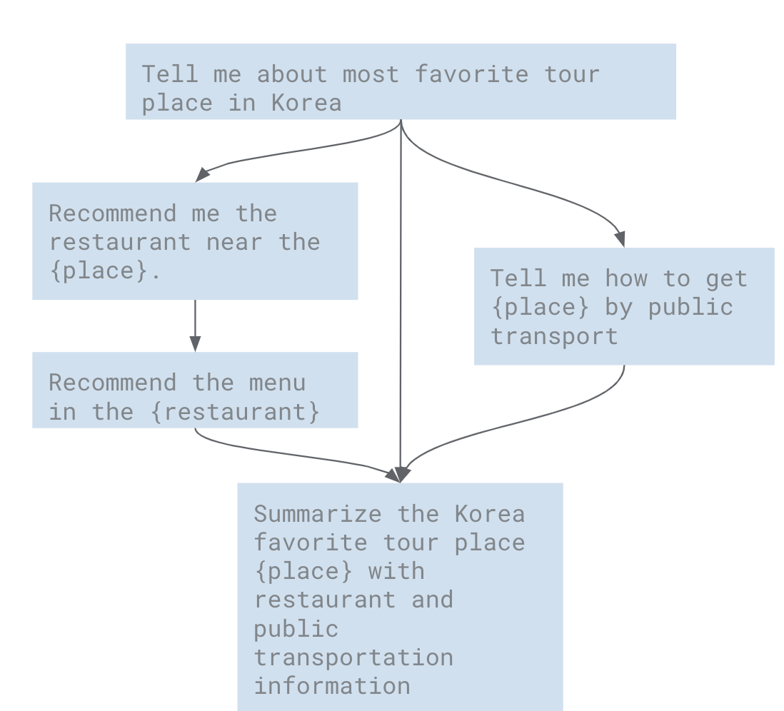 아래는 설명을 돕기 위한 예제로, “대한민국에서 가장 유명한 관광지 정보”를 얻은후에, “그 관광지 근처의 유명한 레스토랑", “ 그 레스토랑의 유명한 메뉴"를 얻고, 병렬로 “그 관광지에 도착하기 위한 대중 교통 수단" 정보를 얻은 후에, 최종적으로 3개의 정보를 취합하는 워크 플로우 구조이다.