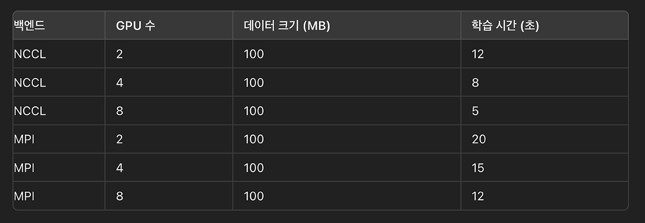 dist.init_process_group("nccl", rank=rank, world_size=world_size) #MPI 백앤드를 사용할경우 "nccl"을 "mpi"로 변경