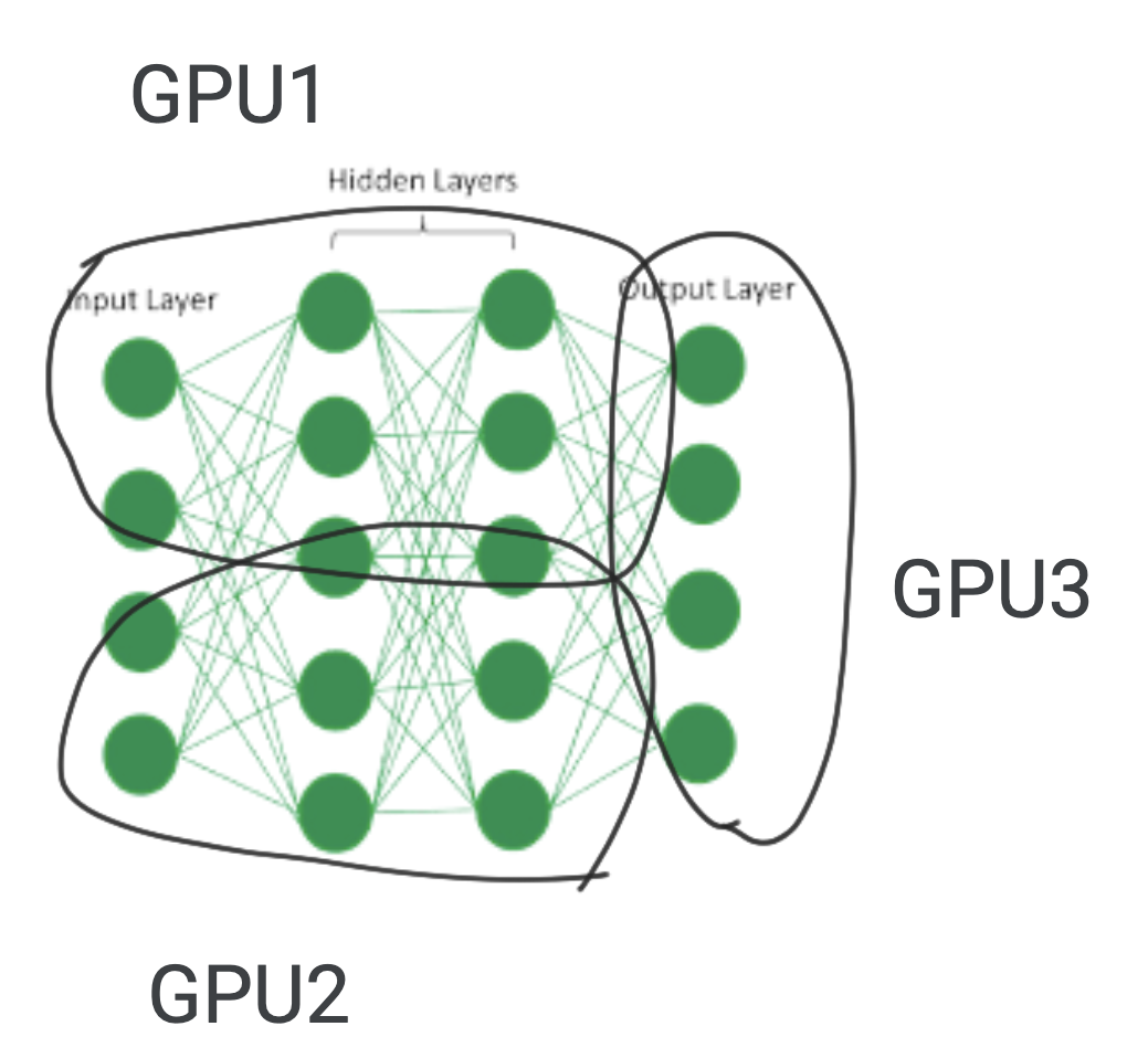 - 모델 병렬화 (텐서 병렬화) : 텐서 병렬화는 모델 병렬화중 하나로, 모델을 횡으로 잘라서 학습하는 각각의 모델 일부를 다른 머신에서 학습하는 방식이다. 예를 들어 아래 그림과 같이 GPU1에서 레이어 1,2,3 의 반을 학습시키고, GPU2에서 레이어 1,2,3의 나머지를 학습 시킨후 GPU 3에서 이 학습된 내용을 합치는 방식이다.