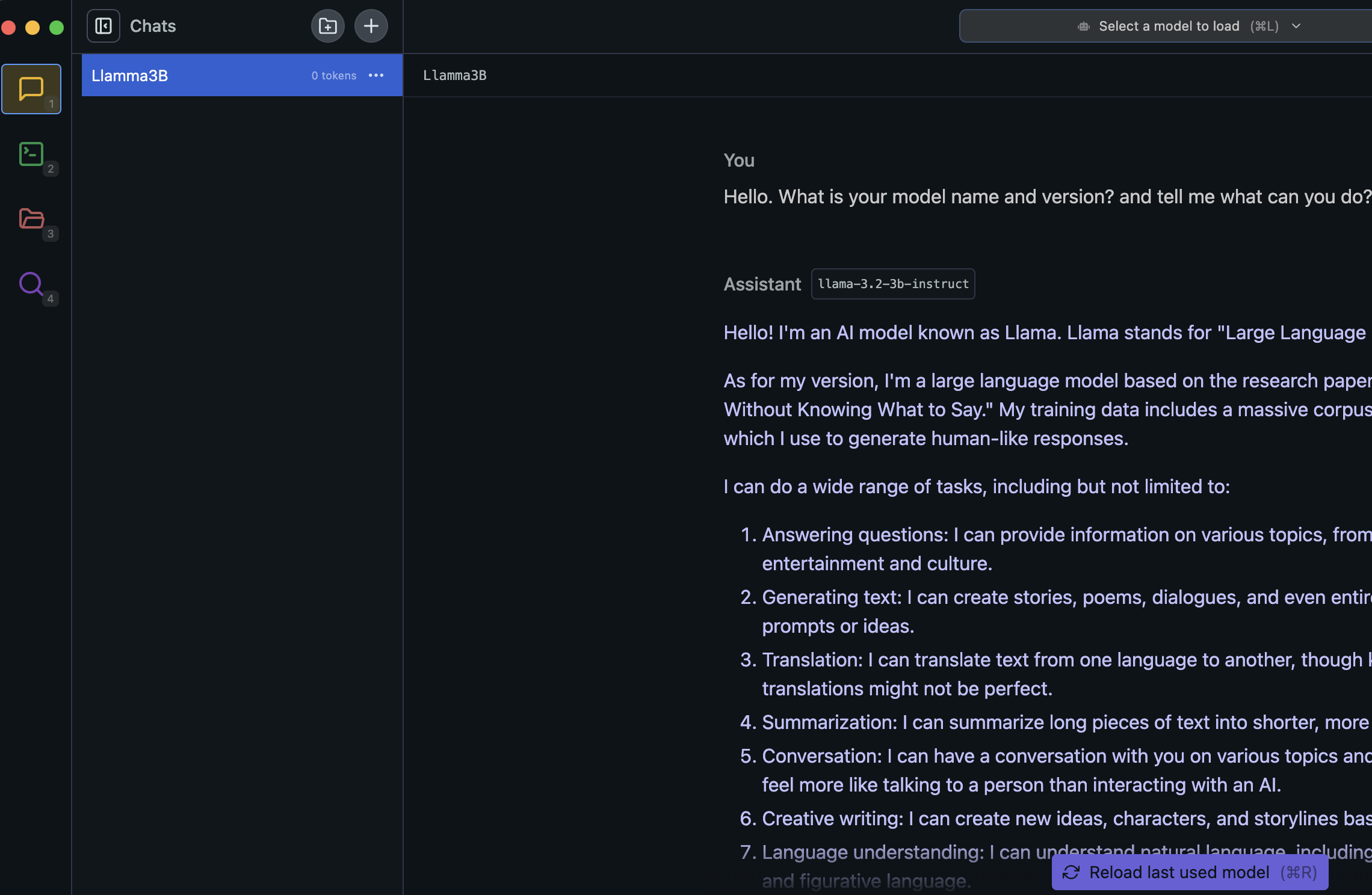 개인적으로는 LMStudio를 좀 더 선호하는데, LMStudio는 아래와 같이 GUI 베이스로, 쳇봇 GUI를 지원하기 때문에 좀더 깔끔하게 사용할 수 있고, 히스토리 관리등이 가능하다.