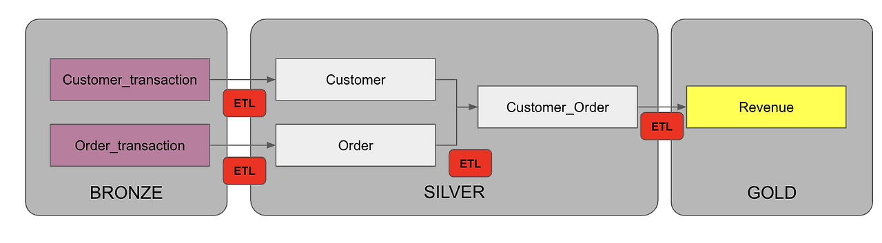 Bronze에는 Customer_transaction과 Order_transaction 테이블이 있는데, 이는 외부에서 수집한 원본 데이터이다. 예를 들어 Customer_transaction은 사용자 데이터로 MySQL에서 수집했다고 하고, Order_transaction은 주문 데이터로 Kafka를 통해서 수집되었다고 하자. 이렇게 수집된 원본 데이터는 Bronze 계층에 저장된다.