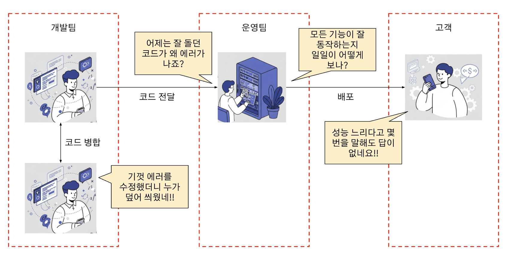 - 개발팀과 운영팀의 분리: 개발과 운영 조직이 완전히 분리된 조직에서는 협업이 어려움