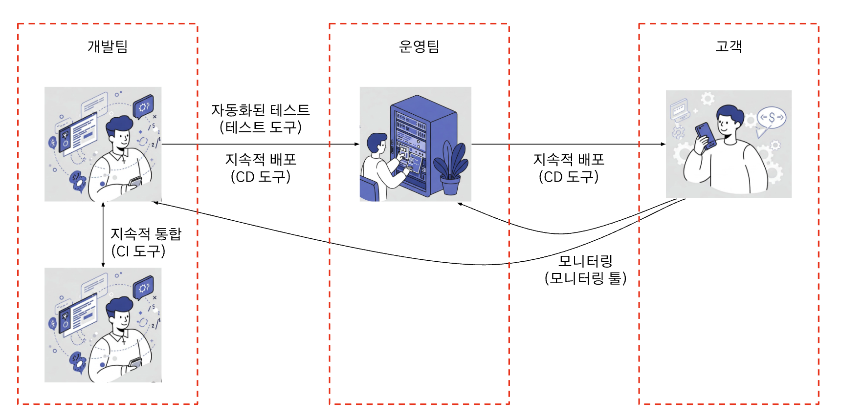 ⇒ 개발자와 운영자, 고객 간 IT 시스템을 통한 협업