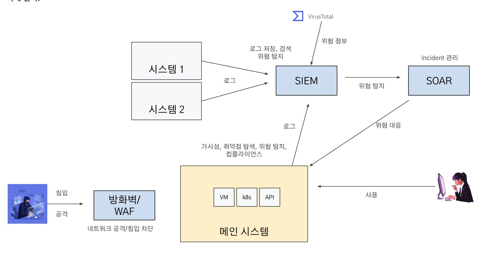 다음은 전형적인 SecOps 환경의 예시이다. SIEM에서 각 시스템의 정보(로그, 이벤트 등)를 수집하여 위협정보를 이용하여 보안 위협을 탐지하고, 탐지된 결과는 SOAR를 이용하여 인시던트 형태로 관리하고 플레이북을 통한 대응을 하게 된다.