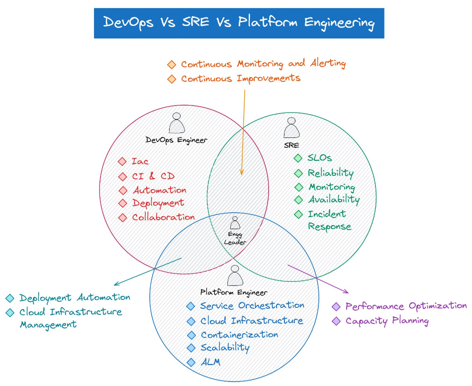 DevOps 엔지니어는 개발과 운영 사이의 간격을 줄이고 CI/CD 파이프라인 구축, 자동화, 인프라 관리, 모니터링 등의 업무를 수행한다. 여기에 각각의 전문성을 띤 SRE, 플랫폼 엔지니어 등의 역할로 다양화 하고 있다. 이들 모두 개발, 운영 팀 사이에서 협업을 위한 역할을 하며 지속적인 개선의 문화를 중시하는 면에서는 공통적인 부분이 있다.