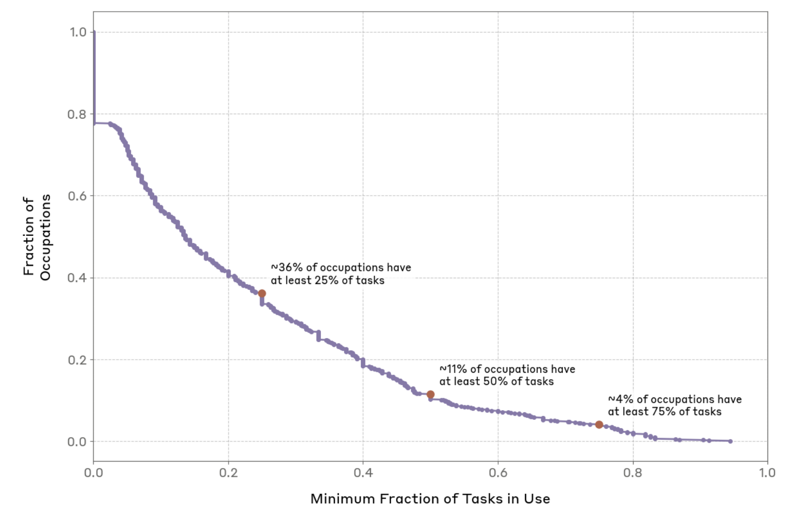 활용도 분석 내용을 보면 36%의 직업에서 25% 이상의 업무에 Generative AI를 사용하고 있고, 11%에는 벌써 50% 이상의 업무를 Generative AI를 이용하고 있다. 즉, Generative AI가 벌써 실제 업무에 대한 적용도가 높아지고 실무적으로 사용되고 있다고 볼 수 있다.