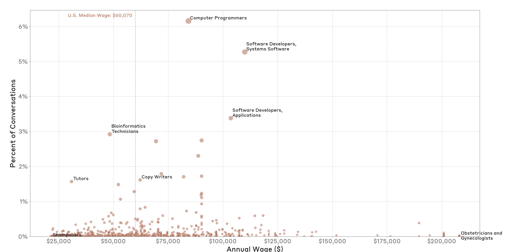 교육 수준과 임금에서도 의미있는 데이터가 보이는데, AI 사용량은 중상위 임금분위에서 최고조에 달하며, 특히 컴퓨터 프로그래머, 웹 개발자와 같은 고임금 기술직에서 높게 나타난다. 그러나 의사와 같은 초고임금 직종이나 식당 종업원과 같은 저임금 업종에서는 사용량이 상대적으로 낮다. 특히 직업 준비 수준 기준으로, 상당한 준비가 필요한 직업 (Considerable preparation needeed Job Zone 4), 즉 학사 학위 이상이 필요한 직업군에서 사용량이 높으며, Zone 5 와 같은 고급 학위가 필요한 직업에는 상대적으로 많이 사용되고 있지 않다.