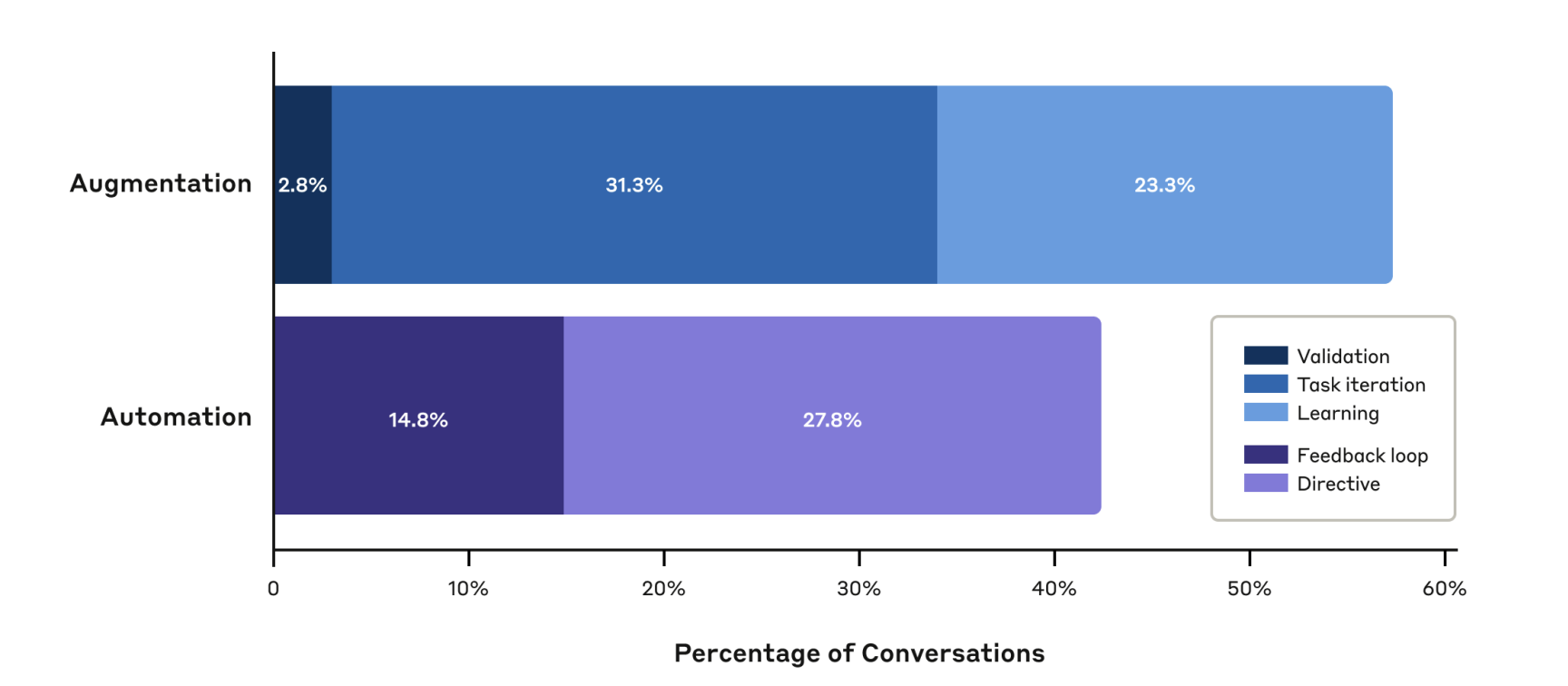 사용 형태 부분에서는 Generative AI를 이용한 자동화 보다는 (42.6%) Generative AI를 통해서 사람이 도움을 받는 형태 (57.4%)가 더 많으며, 완전 자동화 부분은 27.8% 으로 낮은편이지만, 생각보다 많은 업무를 Generative AI를 이용해서 완전 자동화 함을 볼 수 있다.
