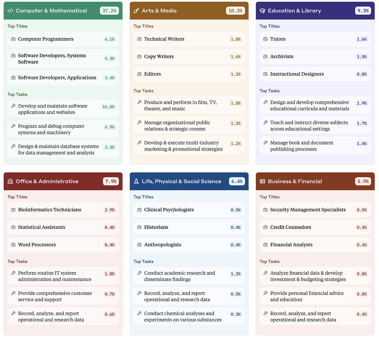 실제로 아래 차트를 보면, LLM 공급자인 앤트로픽에서 LLM 모델이 어디서 많이 사용되는지를 조사한 통계자료가 있는데, 37.2%가 컴퓨터 관련(개발 관련)이다. 그외에 10.3%가 Art & Media쪽인데, 광고/마케팅이나 컨텐츠 생성쪽이다.