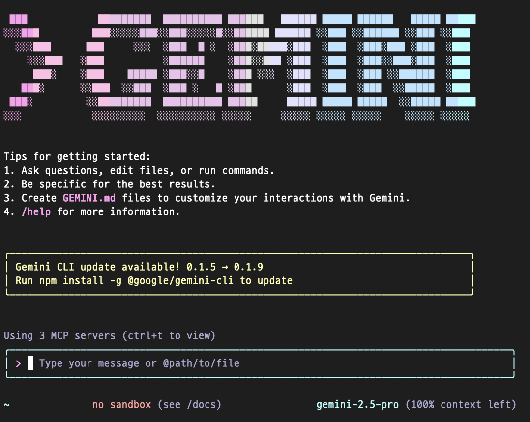 일단 API나 웹서비스가 아닌 CLI이기 때문에, 로컬 머신에서 실행이 되고, 이는 Gemini 모델이 Local 환경을 접근이 가능하다는 것이다. 즉 디스크에 있는 파일을 읽을 수 있으며, 로컬에 있는 명령어들을 모두 실행할 수 있게 된다. 이게 별것 아니라고 생각할 수 있지만, 아주 큰 가치를 갖는데, 예를 들어 내가 코딩을 할때 내 로컬 디렉토리에 있는 코드를 참고해서 코드를 생성하게 할 수 있고, 생성된 코드를 node.js, python 등을 이용해서 직접 실행하고, 테스트 코드등을 실행할 수 있도록 해준다. 즉 로컬 개발환경에 대한 풀 컨트롤과 자동화가 가능하게 된다는 이야기이다.
