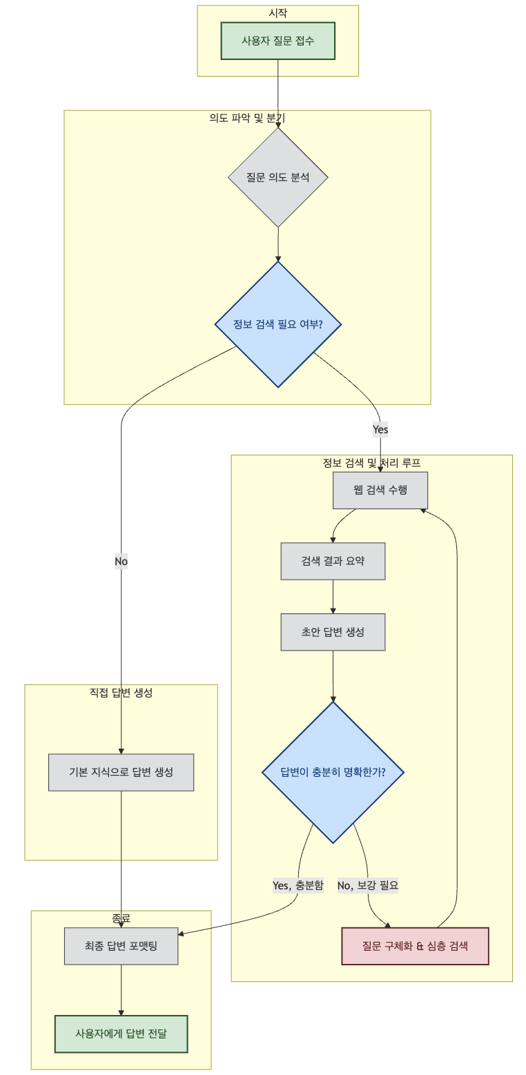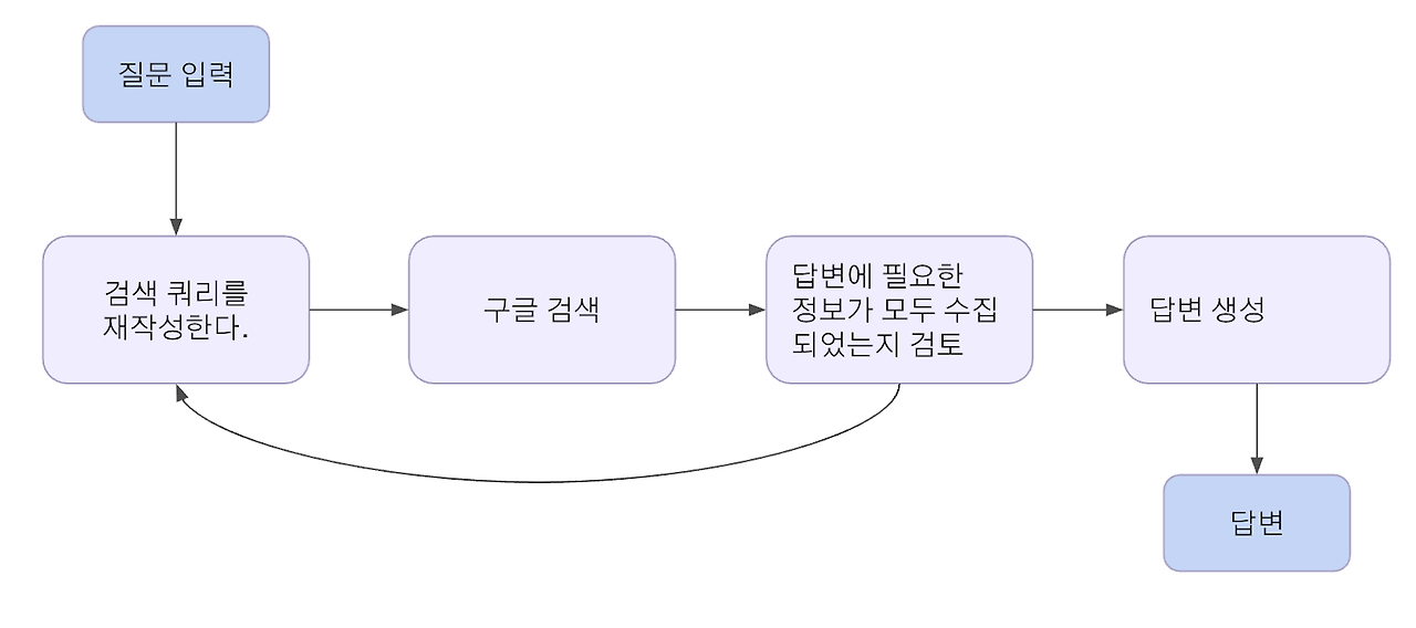아래 구조와 같이 질문을 분석해서 좀 더 명확한 프롬프트로 만들어내고, 구글 검색을 한 후, 검색 내용이 답변을 하는데 충분한 정보를 가지고 있는지 판단을 하고, 만약에 검색된 정보가 충분하지 않으면 질문을 변경해서 다시 구글 검색을 하고, 충분한 정보를 수집할때 까지 이 과정을 반복한 다음에, 이 정보를 이용해서 답변을 생성해서 리턴한다.