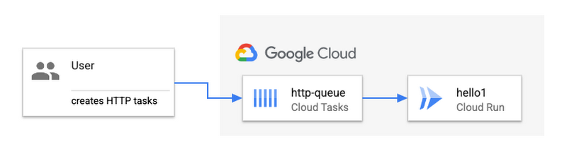 아래 구조와 같이 Cloud Task를 큐로 사용하여, Cloud Run등에 메시지를 Push (HTTP 호출) 방식으로 전달이 가능하다.