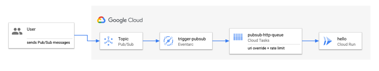 아래 구조는 EventArc에서 특정 메시지를 CloudRun으로 보낼때, CloudRun이 Over Scale out이 되지 않도록 Cloud Tasks 를 중간에 넣어서 Rate limit (throttling 용도로 사용한 구조이다.)