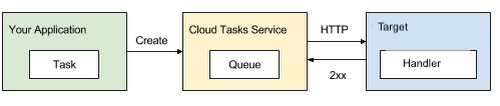 CloudTask에 전달/저장되는 메시지를 Task라고 하며, 메시지는 CloudTask 내부 큐에 저장이 된다. 그리고, Target Destination으로 최종 전달이 되는데, 이 Task를 받아서 처리하는 부분을 Handler라고 한다.