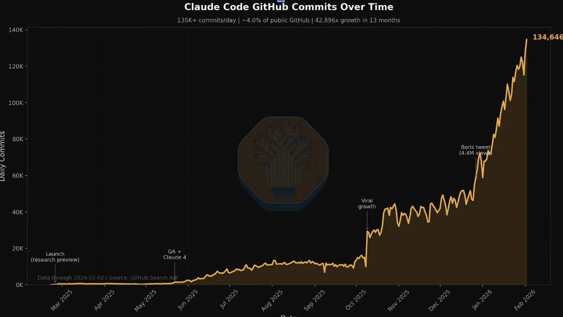 아래 표를 보면, GitHub에 Claude Code를 이용해 Commit 이 된 횟수인데, 2025년 작년 10월을 기점으로 폭발적으로 증가하면서 2026년에 급격하게 한번 더 증가하는 패턴을 볼 수 있다.